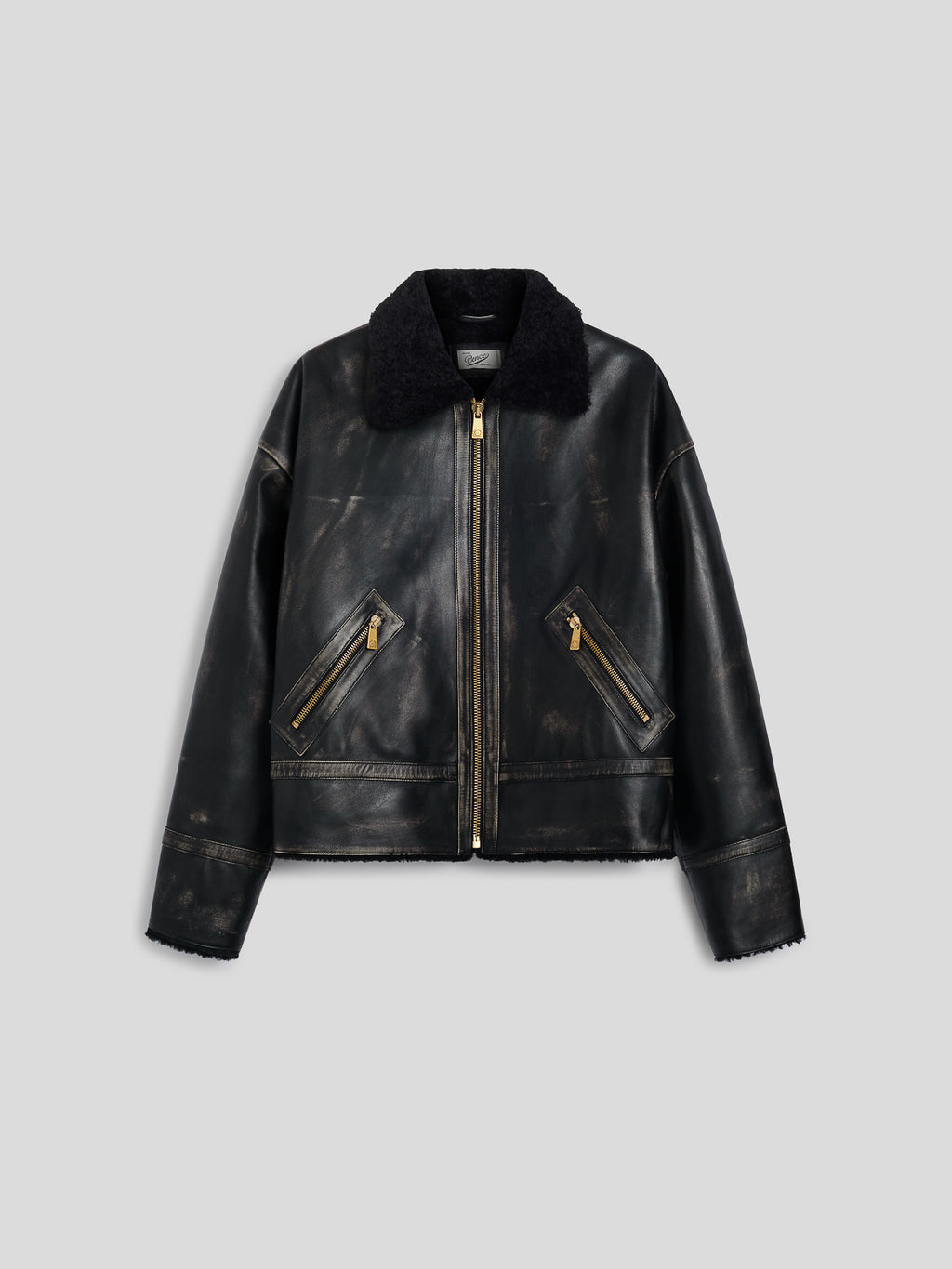 Un giubbino over in pelle di agnello used con interno in shearling che conferisce al capo calore e stile. Il design contemporaneo lo rende un capo deciso e di carattere.
