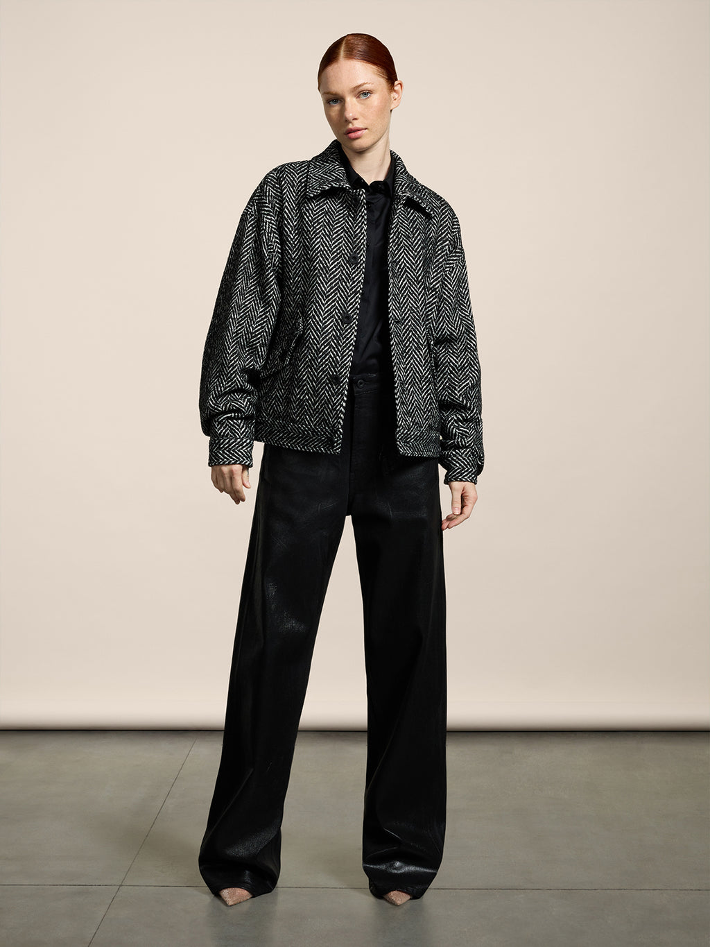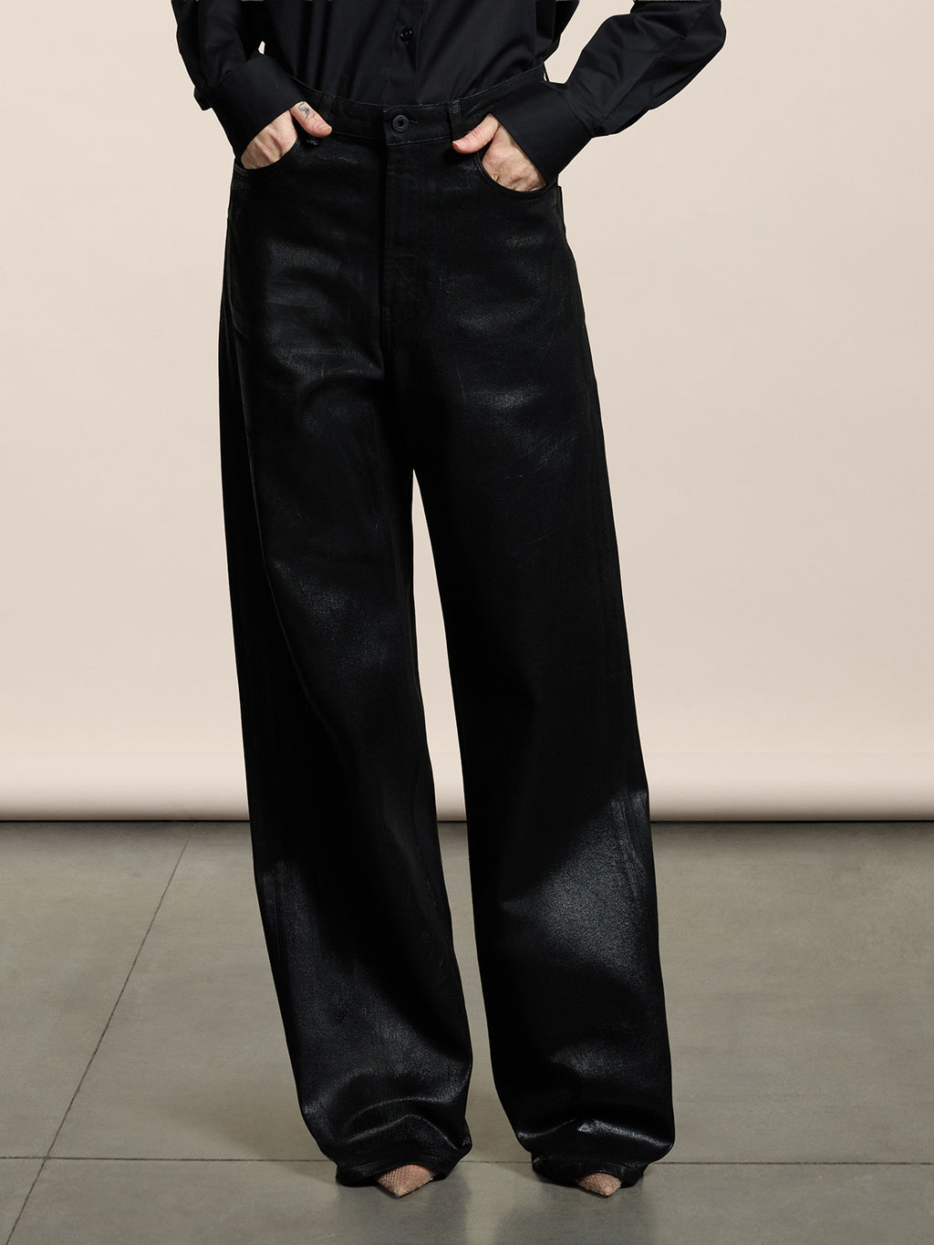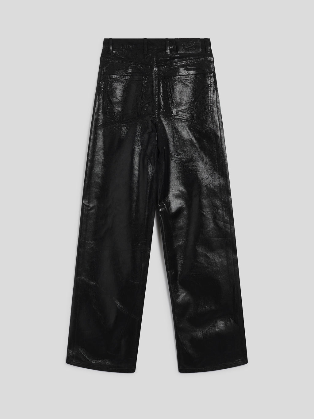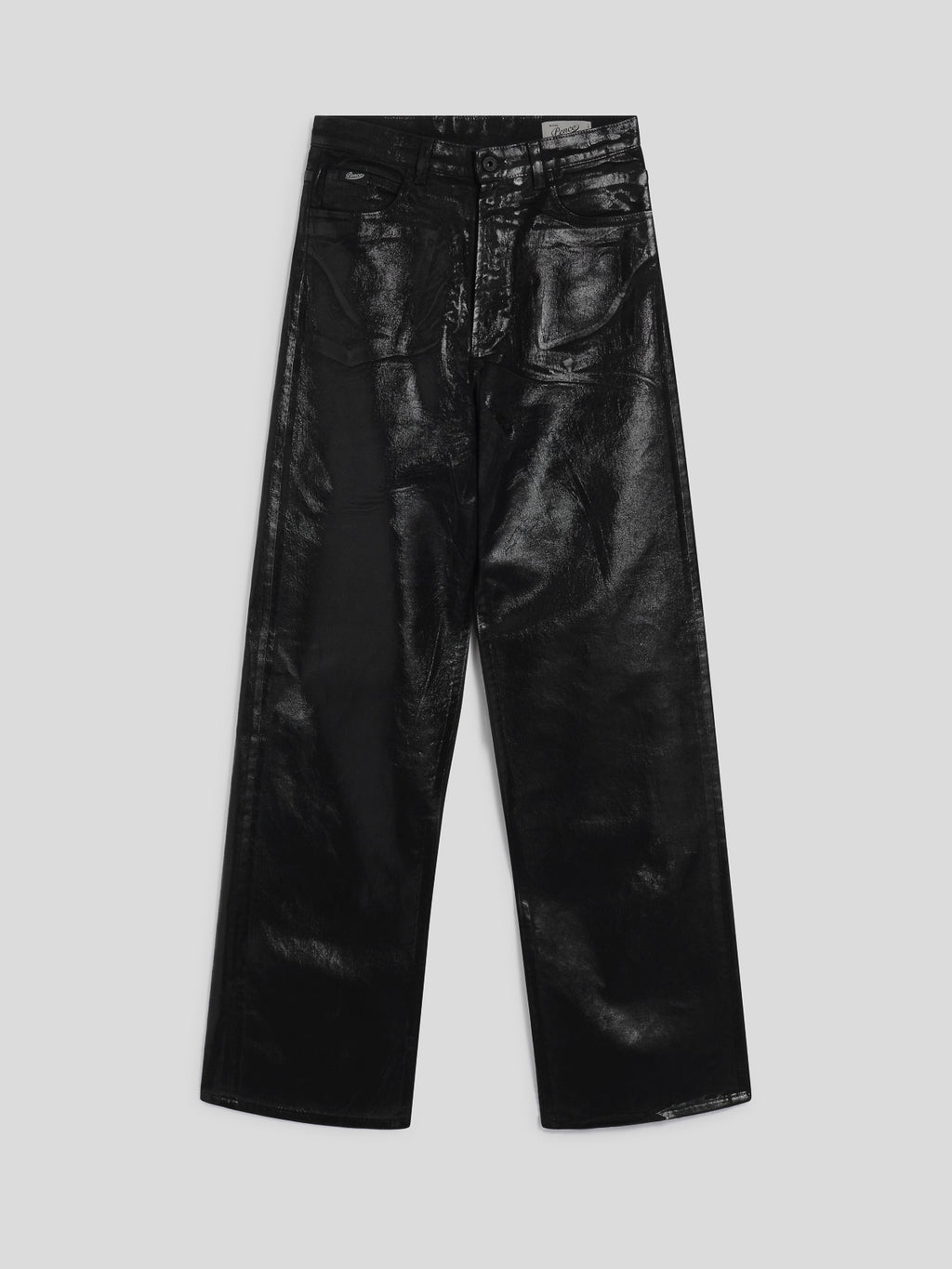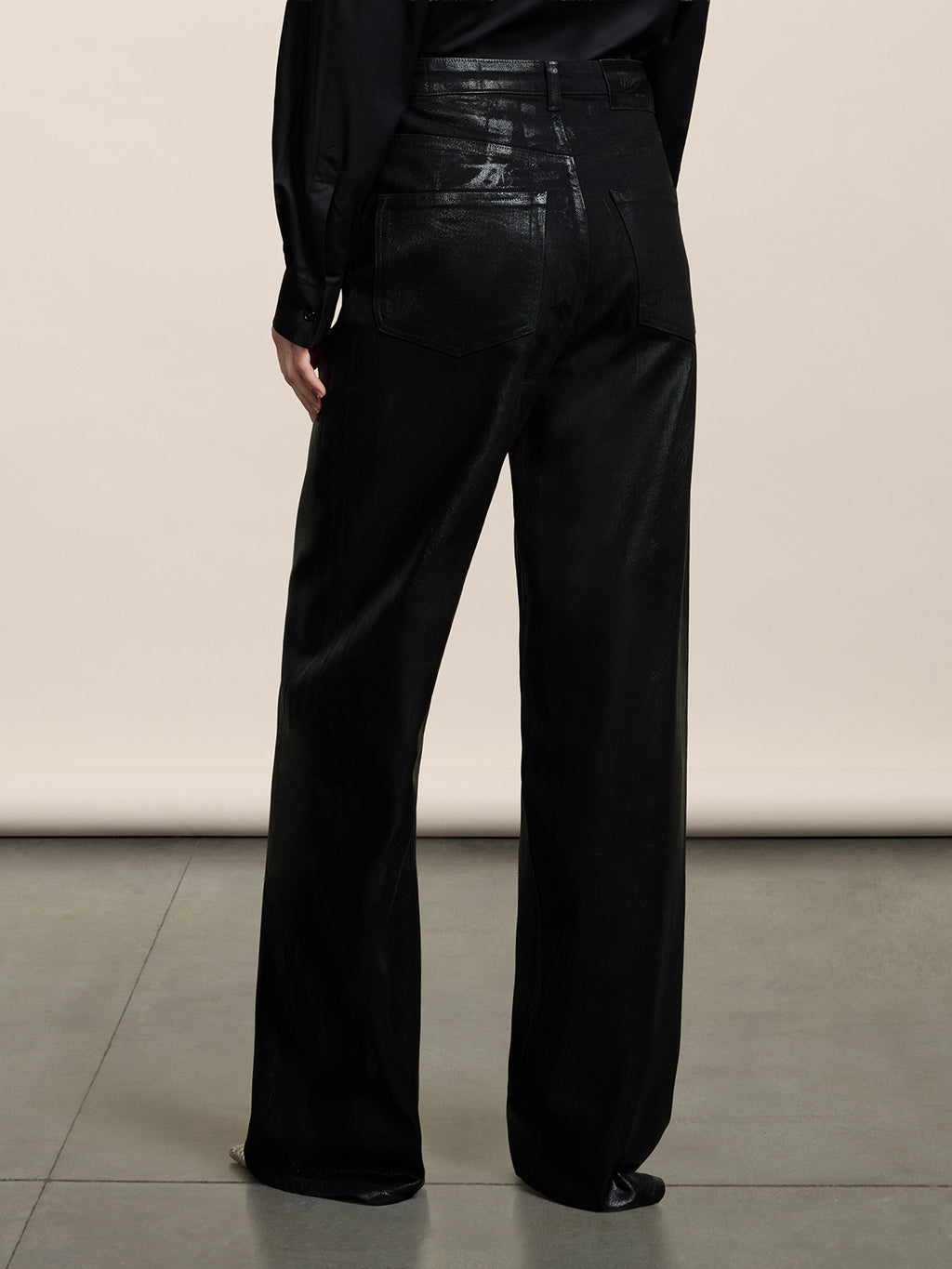 WOMEN'S 5 POCKET HIGH WAIST WIDE LEG PANT IN DENIM WITH METALLIC COATING BLACK